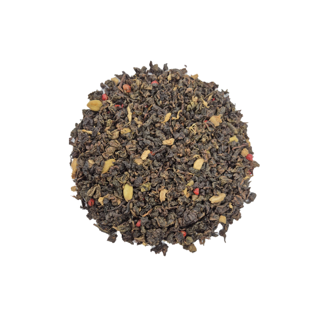 Una mezcla aromática que fusiona la suavidad del té azul oolong con el calor especiado de ingredientes tradicionales como canela, clavo y cardamomo, ofreciendo una experiencia reconfortante y llena de sabor.