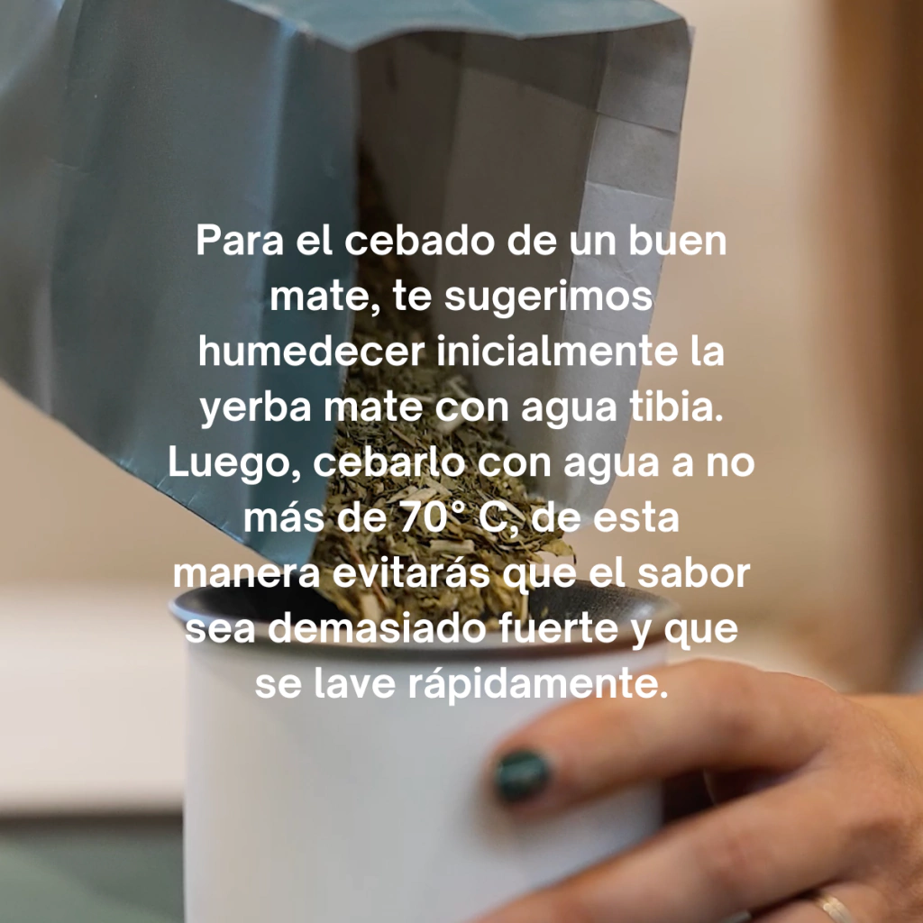 Para el cebado de un buen mate, sugerimos humedecer inicialmente la yerba con agua tibia. Luego cebarlo con agua a no más de 70°, de esta forma evitas que el sabor sea muy fuerte o se lave fácilmente.